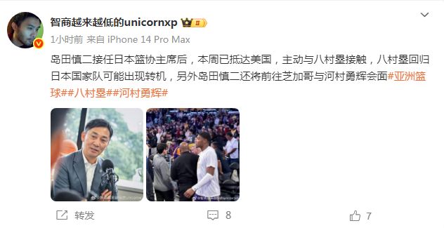 如今根据欧洲篮球及选秀专家王健报道:“岛田慎二接任日本篮协主席后,本周已抵达美国,主动与八村塁接触,八村塁回归日本国家队可能出现转机,另外岛田慎二还将前往芝加哥与河村勇辉会面。”